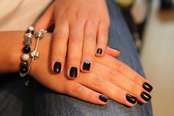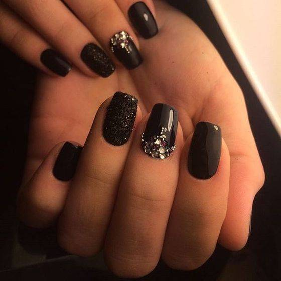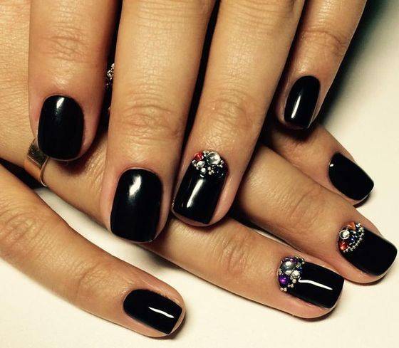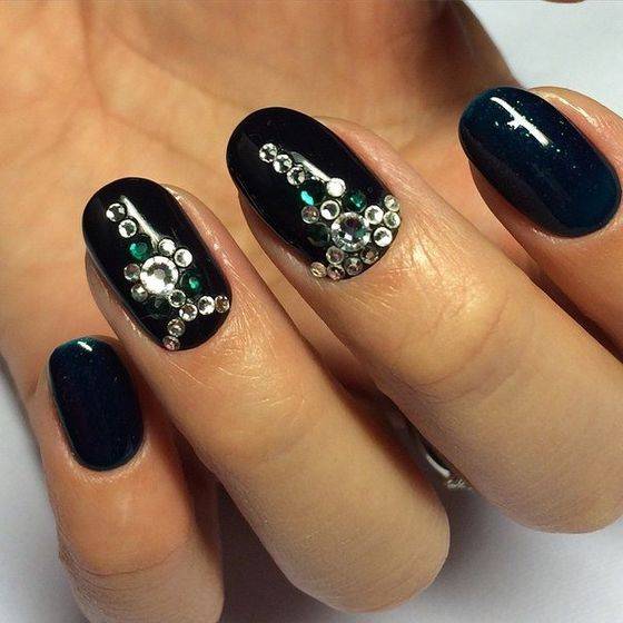 На длинных ногтях стразы идеально сочетаются со светлым лаком. Если предпочтение отдается темным оттенкам, следует использовать матовый топ.