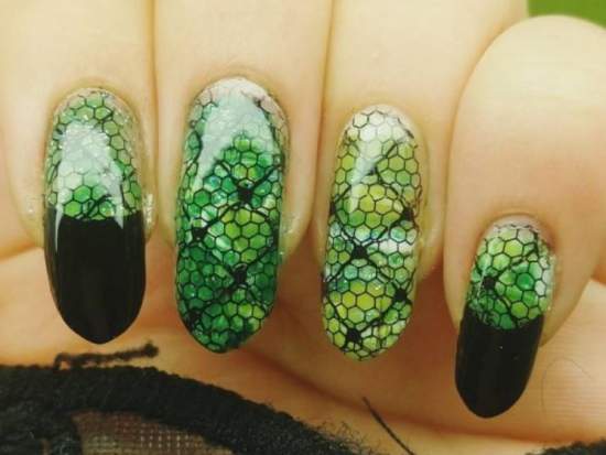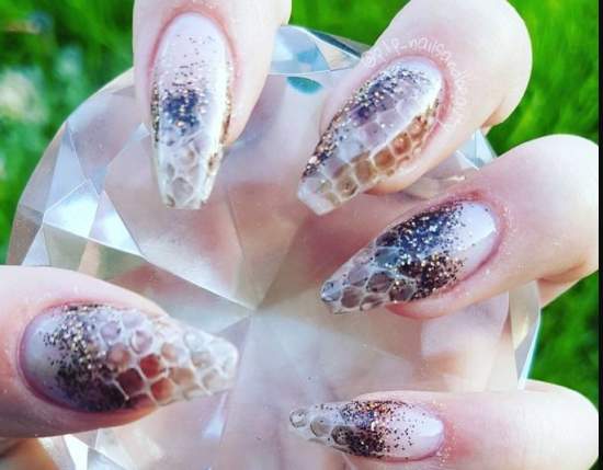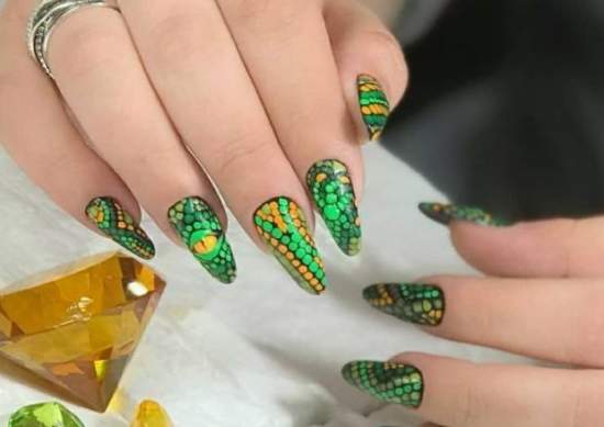 На прозрачной подложке эффектно смотрится изображение змеи фрагментами. На каждом ноготке рисуется часть рептилии, а если выстроить все ногти в ряд, можно увидеть целостный рисунок. Для дизайна лучше использовать насыщенные цвета, которые будут выделяться на фоне натуральных ногтевых пластин.