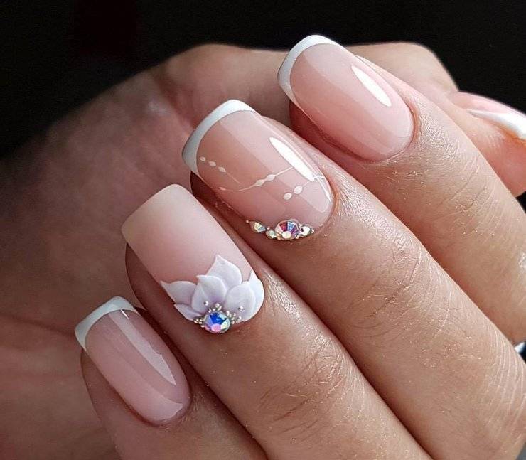 Этот вариант маникюра обычно выбирают невесты. Но он подойдет и для повседневной носки. Классический вариант исполнения дизайна — светло-розовая подложка, белая линия и светлые стразы. В 2022 году ни цвета, ни украшения уже не будут актуальны.
