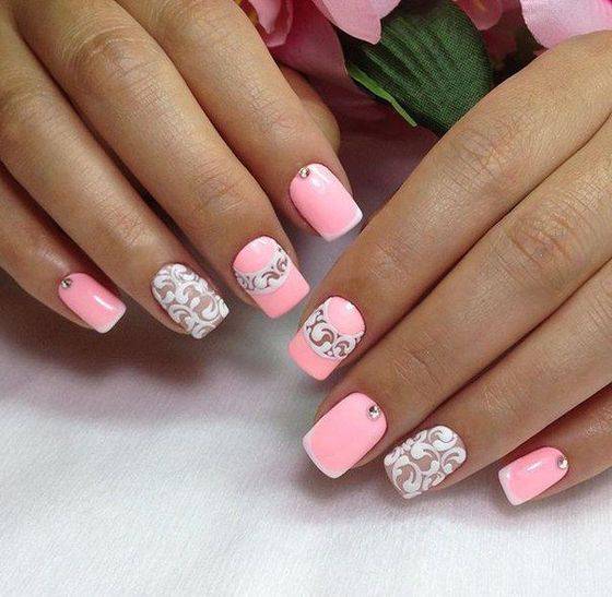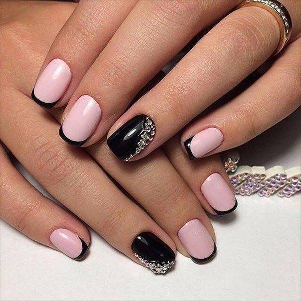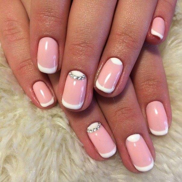 Это может быть двойной розово-белый маникюр с выделенной камушками лункой на одном или двух пальчиках. Или нежно-розовые ноготки с белым френчем и разноцветная россыпь блестящих камней.