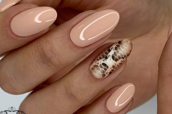 Нюдовый маникюр со змеей может стать отличным вариантом для повседневной носки. Для него используются полупрозрачные базы и нежные кремовые оттенки гель-лаков. Нейл-арт одинаково хорошо выглядит и на овальных, и на квадратных ноготках.