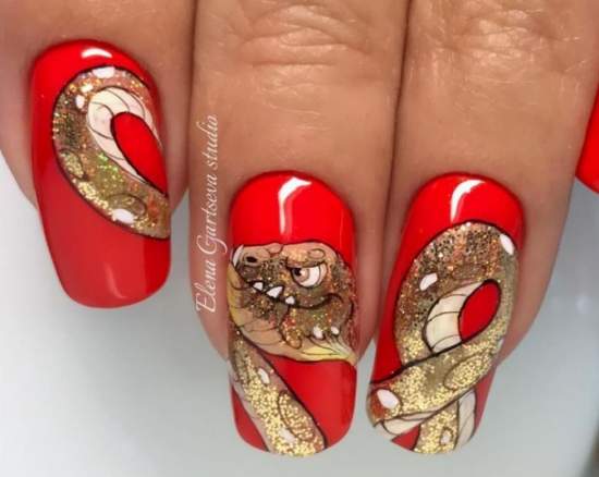 Красиво на красном смотрится змеиная кожа в золотом цвете. Ее можно создать с помощью золотой гель-краски или фольги