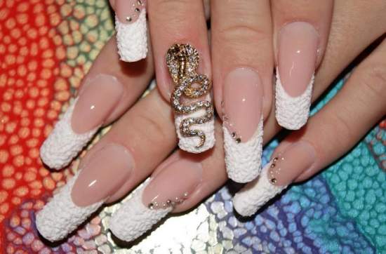 Если ногти длинные, допускается объединение разных видов техники, как то французского и лунного с дополнением небольшого количества камешков.