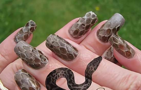 Для придания дизайну объема можно использовать прозрачную базу для гель-лака. Ее наносят тонкой кистью сверху узора или рисунка рептилии и полимеризуют в лампе. После застывания базы получается выпуклое изображение змейки или реалистичная чешуя.