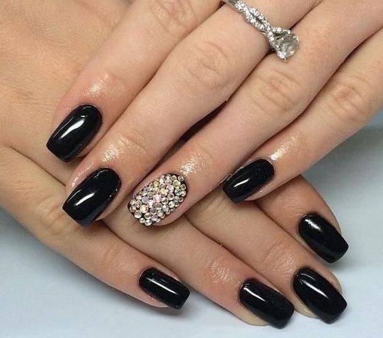 Роскошный ноготь, который выложен блестящими камнями – еще одно оригинальное решение для маникюра со стразами и дизайном ногтей фольгой. С таким дизайном не нужно сочетать еще какой-либо блеск. Не стоит также клеить еще парочку на соседние ногти. Оптимальным вариантом будет однотонное покрытие, градиент или два цвета.