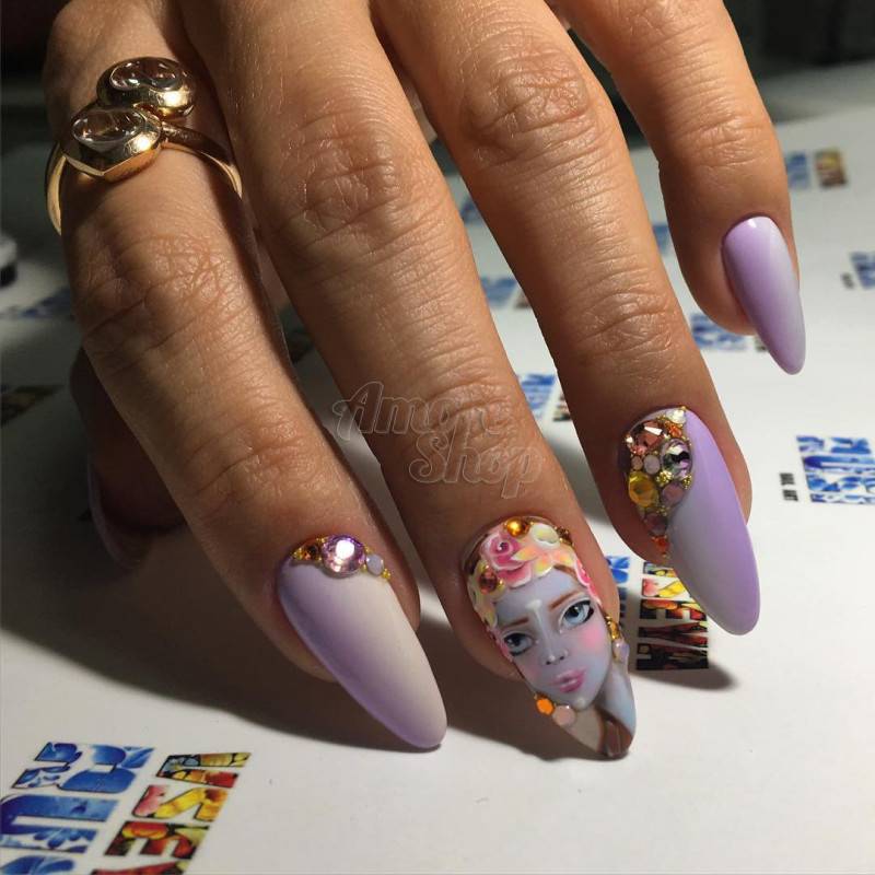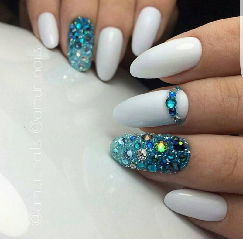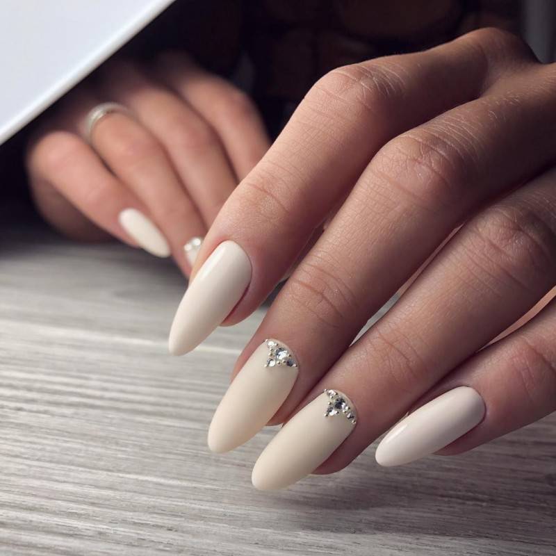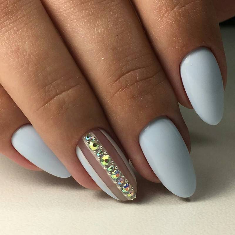 Беспроигрышным вариантом маникюра в этом случае можно назвать классический либо цветной френч с блестящими шармами из стразов на акцентных ноготках либо однотонный дизайн с блестящими узорами. Не менее интересно смотрится на миндальных ноготках матовый дизайн с россыпью хрустальной крошки или композициями из бусин и полусфер. Украшения можно использовать как самостоятельный декор или гармонично сочетать с рисунками. Всё зависит от желания и вкусовых предпочтений.