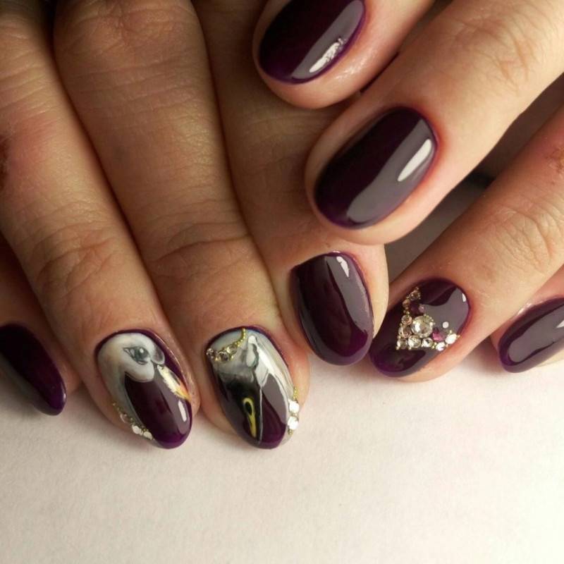 Однотонный маникюр отлично смотрится с несколькими стразами в прикорневой зоне, с композициями из бульонок и камней. Некоторые мастера создают простую геометрию с волнами, рубашкой и другими техниками выкладки камней. Если речь идет о торжественном маникюре, то лучшим вариантом станет однотонный темный маникюр с инкрустацией безымянного пальца.