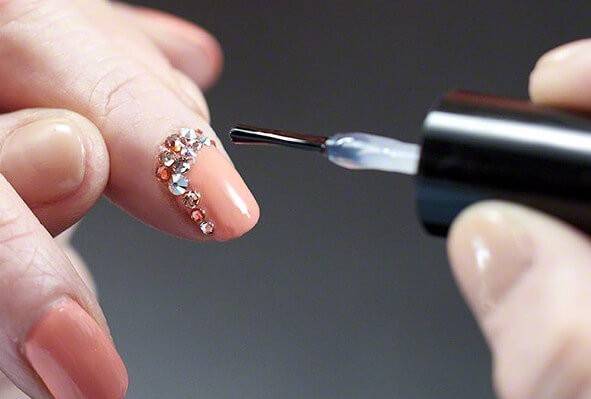 Как видите, ничем особым такой вариант действий не отличается, только искусственные камни укладываются не на гель, а на специальный косметический клей, который можно приобрести практически в любом специализированном магазине.