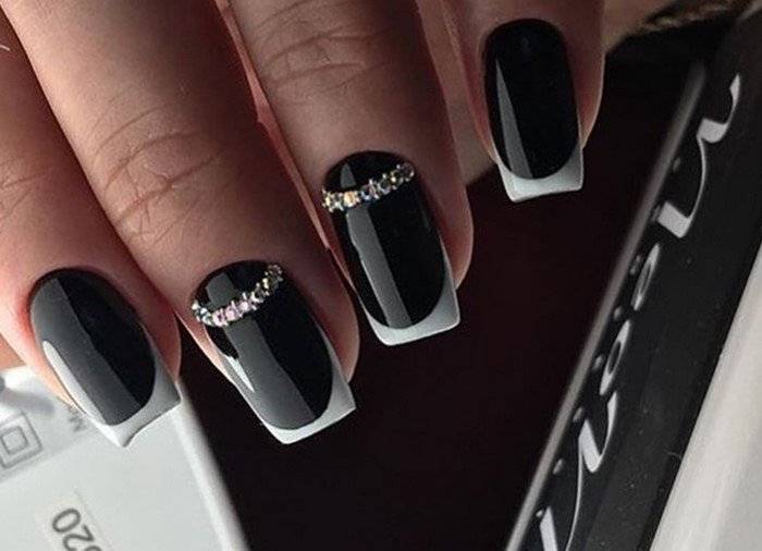 Глянцевый черный цвет с яркими акцентами страз привлекает внимание и вызывает, только приятные ощущения от ногтей. Такой маникюр отлично подойдет для активных девушек, посещения вечеринок