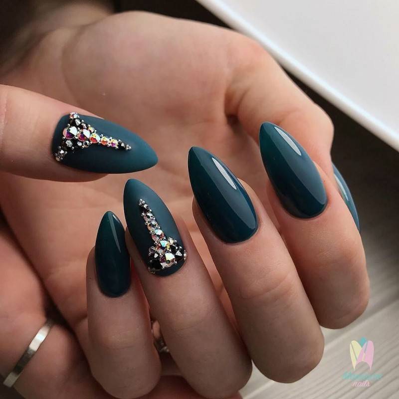 Выразительнее всего матовый маникюр выглядит в темном сочном оттенке — черном, синем, винном, шоколадном. Стразы могут быть контрастными или, наоборот, сочетаться по оттенку с цветом ноготка.