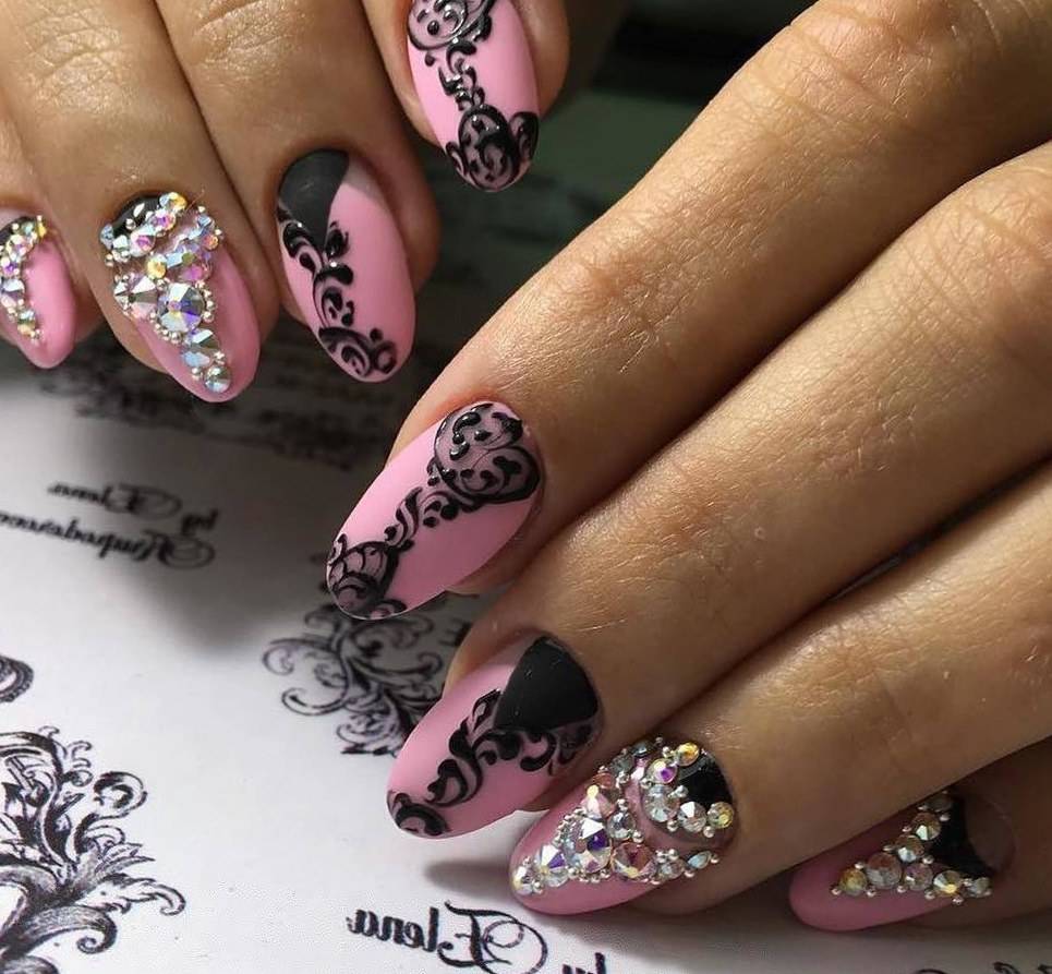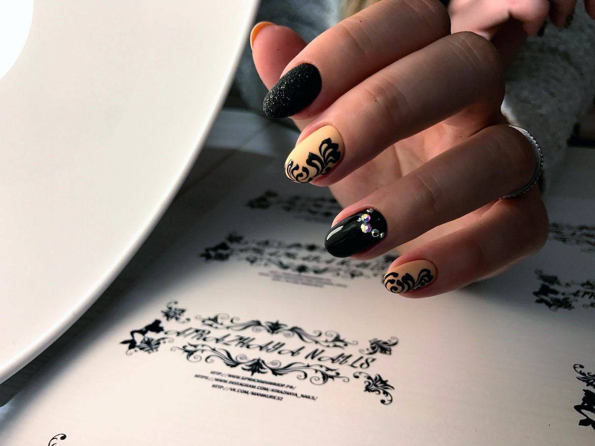 В Японии черный цвет символизирует возраст и мудрость. Поэтому, даже женщинам в возрасте не следует боятся использовать его в своем маникюре. А сочетание в нем вензелей и страз, только подчеркнет изящество Ваших рук.