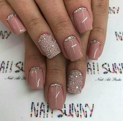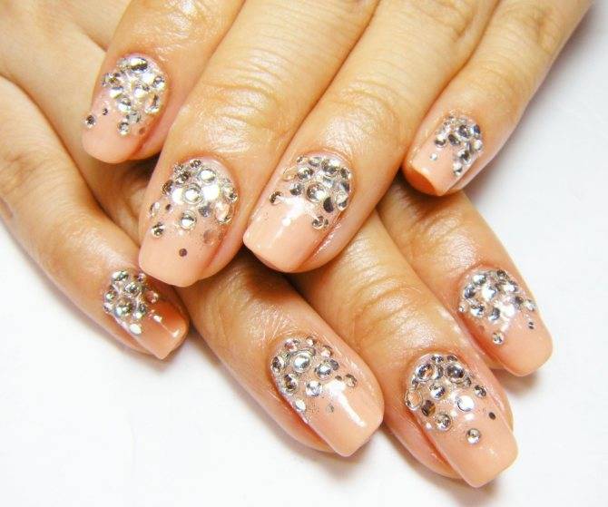 С помощью нюдовых оттенков можно создать нежный маникюр со стразами. Такой дизайн ногтей подходит как юной девушке, так и пожилой женщине. Одним из наиболее красивых расцветок считается матовое покрытие ногтевой пластины, украшенное рисунком такого же цвета, но в глянцевом исполнении. Стразы при этом могут быть прозрачными, золотистыми, серебристыми, белыми.