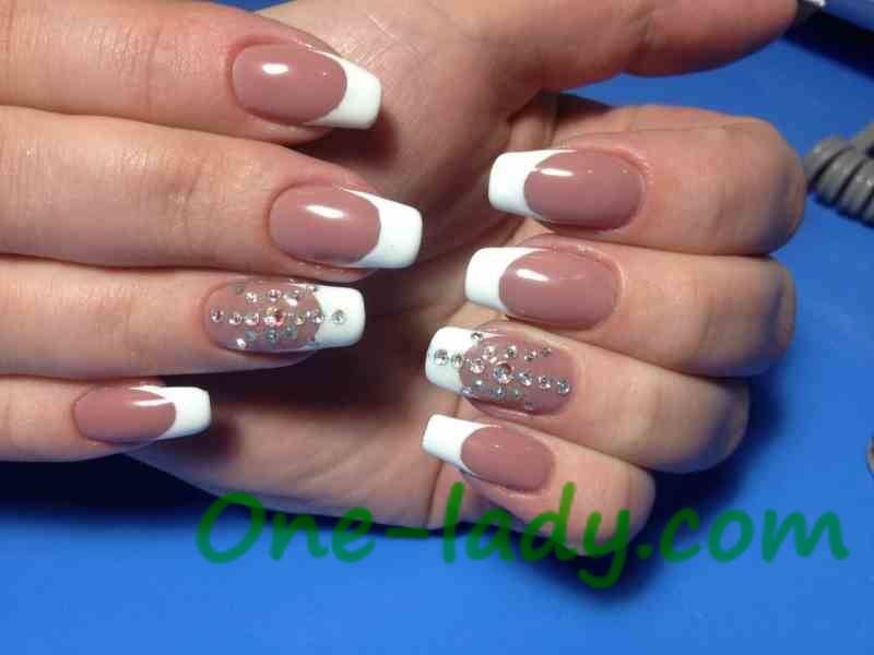 - Наиболее популярным методом красиво выложить стразы на ногтях, является вариант френч и двойной френч. Для такой схемы оптимально использовать небольшие элементы, а можно воспользоваться и замечательной хрустальной крошкой,