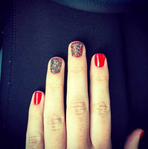 Чтобы убрать излишнюю яркость, покройте ногтевые пластины матовым лаком. А в качестве украшения используйте белые круглые стразы, похожие на жемчуг. Для вечернего выхода дополните образ красной сумочкой и помадой