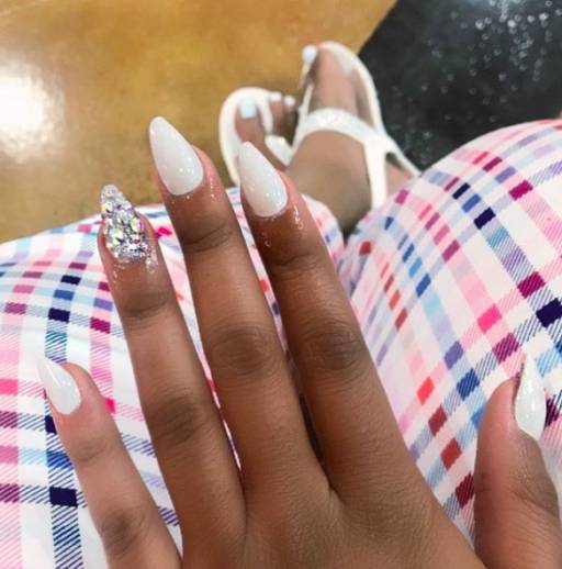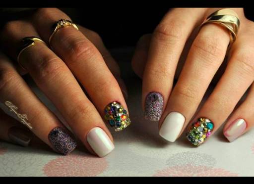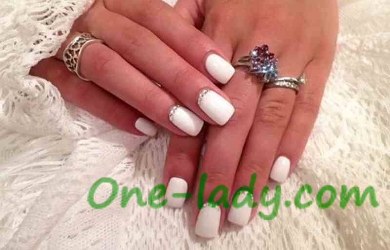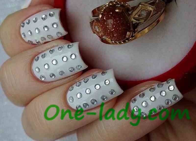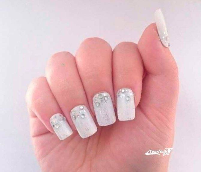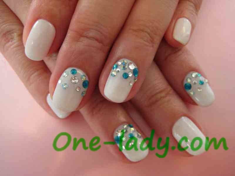 Если вы задумываетесь о создании белого маникюра со стразами, обратите внимание на рисунки на ногтях. Ведь белоснежный фон на ногтевой пластине похож на холст, на котором художник может воплотить свои фантазии и украсить их «драгоценными камнями». Причем, стразы могут быть не только прозрачными, но и цветными или радужными