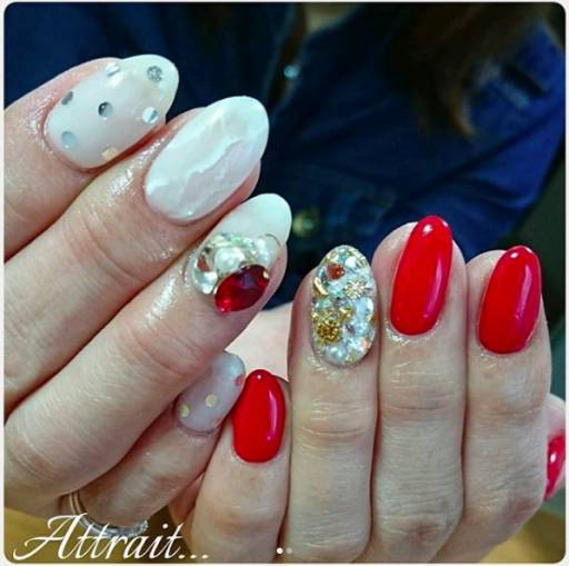Красный маникюр со стразами подходит стильным, уверенным в себе женщинам. Чтобы убрать излишнюю яркость, покройте ногтевые пластины матовым лаком. А в качестве украшения используйте белые круглые стразы, похожие на жемчуг. Для вечернего выхода дополните образ красной сумочкой и помадой.