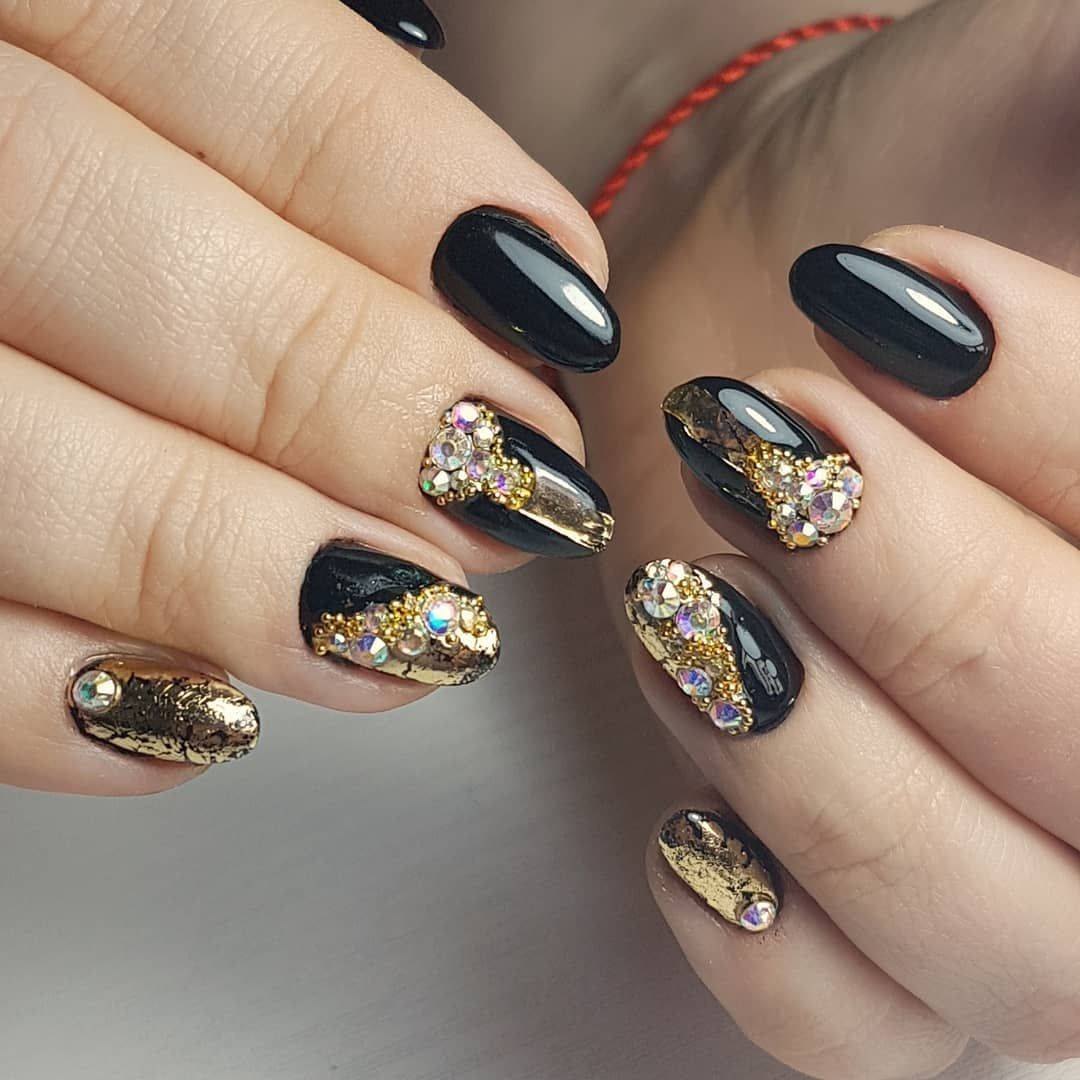 Черный маникюр со стразами красиво смотрится на ногтях короткой и средней длины. На темном фоне можно прочертить геометрические фигуры, ровные линии, зигзаги. Стразы при этом должны быть матовыми или с металлическим блеском. Другой вариант — дерзкий, абстрактный дизайн, яркие, контрастные цвета.