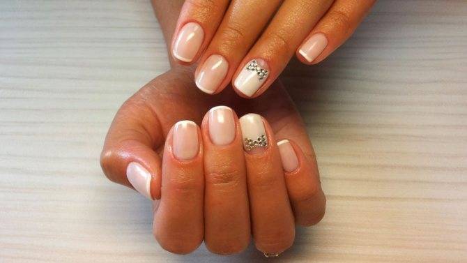 Простой дизайн всегда можно добавить декоративными элементами, чтобы он заиграл новыми красками. Так и в этом варианте. Обычный лунный маникюр украшается переливающимся камнями. Они добавят немного изысканности и лоска покрытию.
