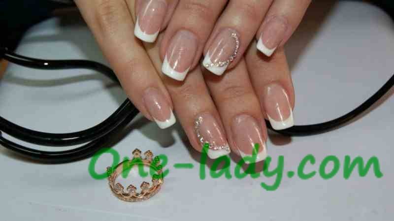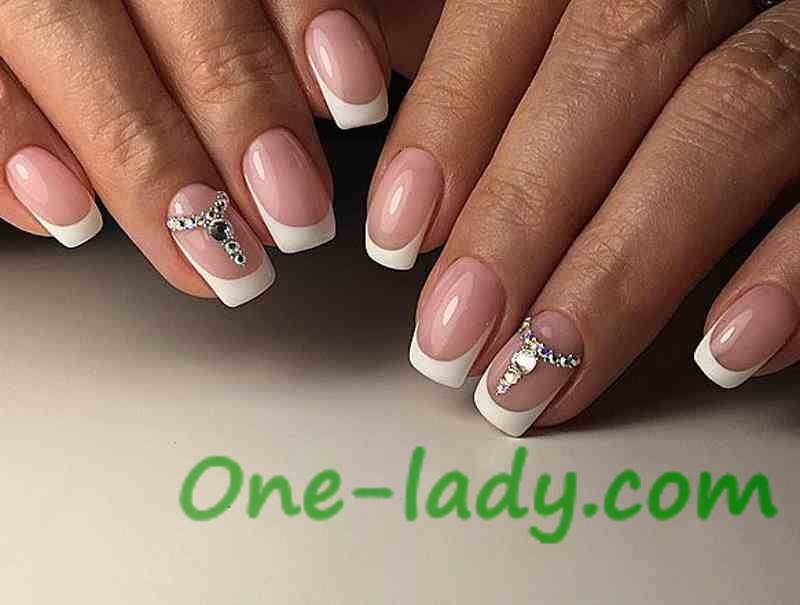 Никогда не теряющий своей актуальности французский маникюр заиграет по-новому, если выполнить линию улыбки не белым лаком, а выложить стразами.