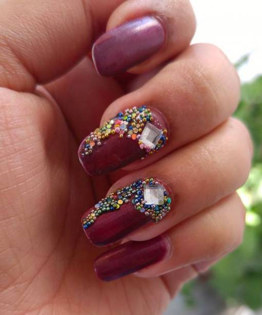 - Большое количество мелких камешков зрительно придадут ему вес и объем, потому лучше оставить такое украшение для длинных ногтей, а на коротких ограничиться небольшим количеством или орнаментом.