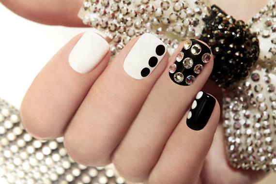 Черный маникюр со стразами придает образу строгость и элегантность, подходит, если требуется создать стиль роковой женщины. В белом варианте стразы подчеркивают женственность и романтичность образа. Цвета основы можно комбинировать. Украшать стразами при однотонном покрытии принято один или два ногтя, подчеркивая красоту и насыщенность основных оттенков.