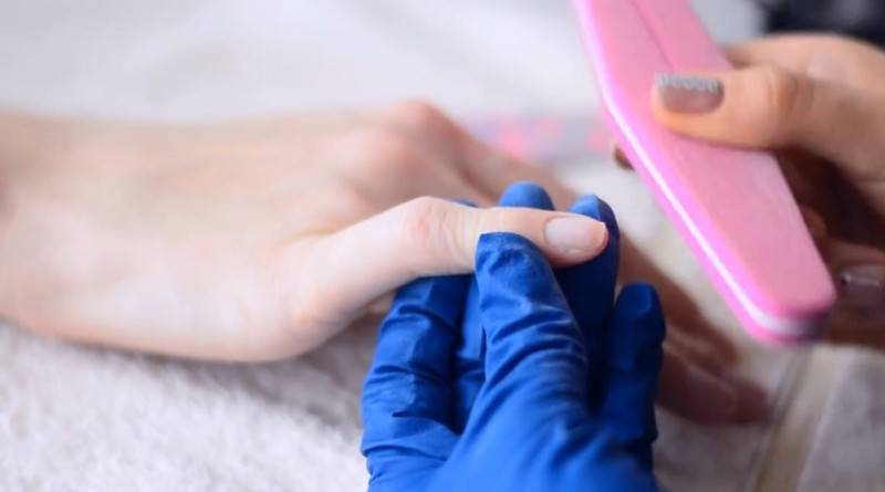 После высыхания кожи область прочистки подкутикульного пространства шлифуют бафом с мелким абразивом. Движения должны быть длинными и только в одном направлении. Также бафом обрабатывают края срезов кутикулы и кожу боковых валиков.