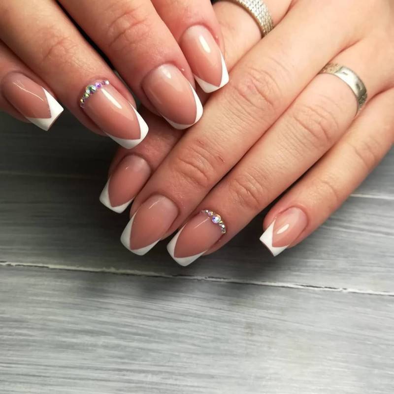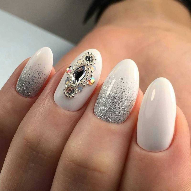 Однотонный маникюр практически не нуждается в декоре, особенно если речь идет о белом цвете. Но вы всегда можете дополнить маникюр стразами или бульонками в прикорневой зоне, серебряным глиттером.