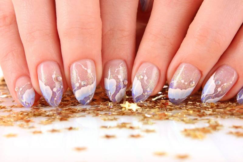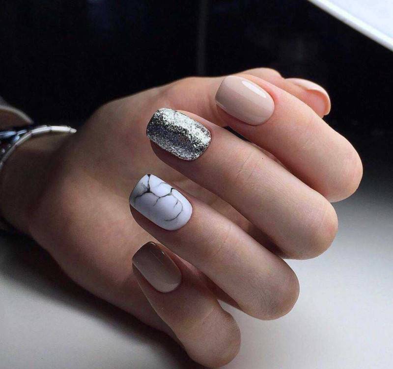 Сдержанный, но в то же время стильный мраморный дизайн с каждым годом лишь набирает популярность. Тонкие линии позволяют добиться имитации натурального камня на ноготках. Наносят их преимущественно с помощью тонкой кисти. Но в домашних условиях для этого нередко выбирают зубочистки или иглы. Сам рисунок лучше всего смотрится на нескольких ноготках. Поскольку так он выступает в качестве акцента в однотонном маникюре. Кстати нередко в одном дизайне можно увидеть не только белый, но черный, зеленый, розовый или серый цвет лака. Благодаря такому сочетанию каждый вариант маникюра смотрится по-разному. Что касается декора, то в данном случае это может быть скотч-лента или же блестки. Но их стоит использовать в минимальном количестве, чтобы не перегрузить покрытие.