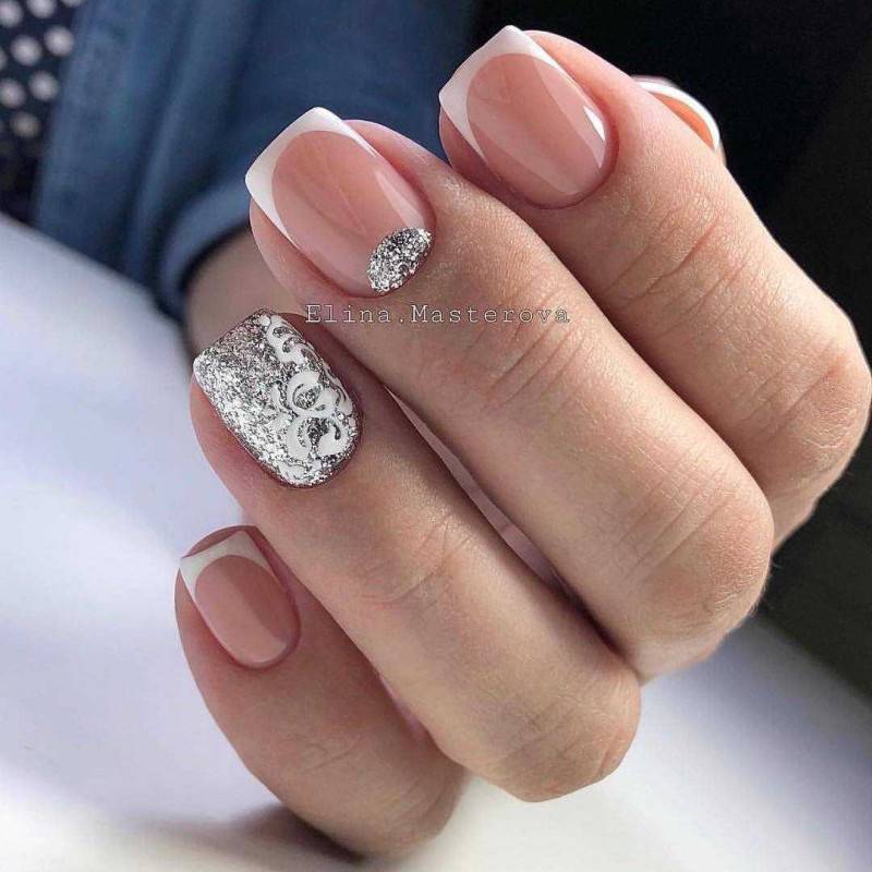 Не ограничивайтесь только однотонными нейл-артами. Добавьте в дизайн кружевной узор, выделите прикорневую зону. Используйте в качестве дополнения розовый цвет. Сочетание белого, розового и серебряного оттенков смотрится на ногтях благородно и очень сдержанно. Пример такого нейл-арта вы можете видеть на фото ниже.