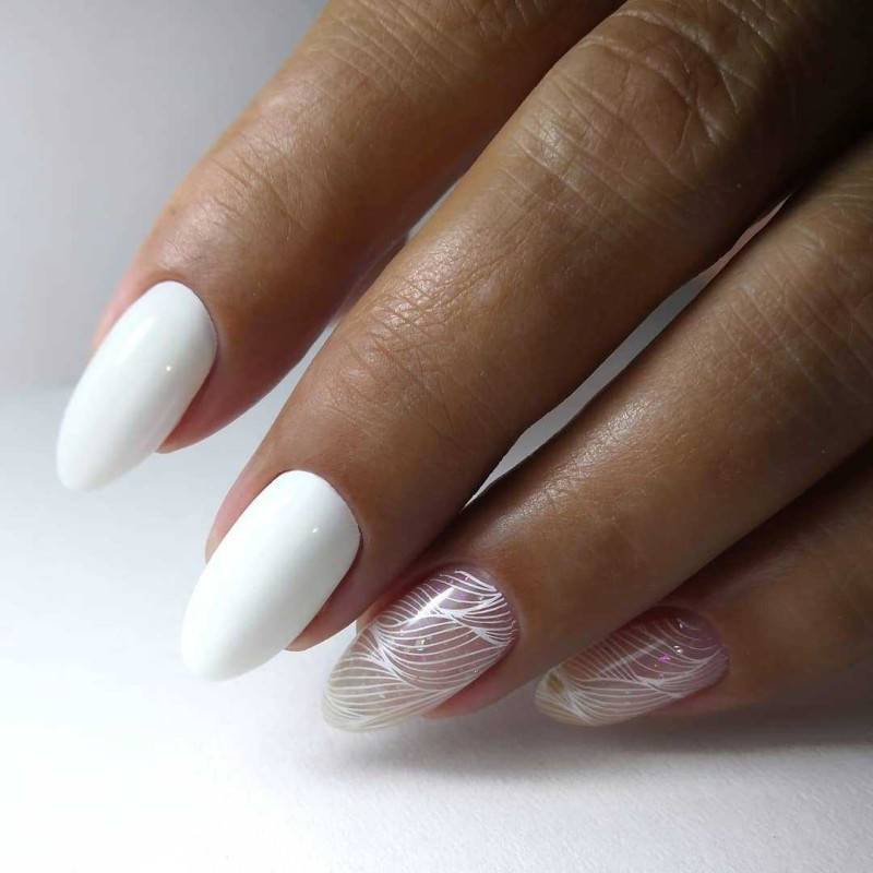Белый цвет визуально увеличивает пространство ногтевой пластины, поэтому он отлично подойдет для декора коротких ноготков. В тренде однотонное покрытие белым цветом, дизайн с растяжкой блестками, использование гель-лаков, в состав которых входит шиммер или глиттер.