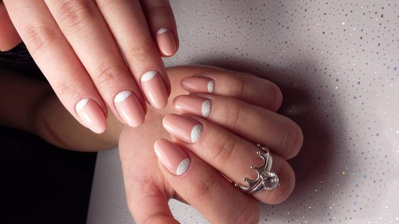 Лунный маникюр возник примерно одновременно с френчем, поэтому данный дизайн смело можно считать классическим и универсальным, ведь они так похожи. Лунный маникюр превосходно выглядит в белом цветовом решении. Разнообразить и сделать интереснее такой маникюр можно при помощи глиттера, страз любого цвета или пудрового напыления. Беспроигрышным и изящным вариантом для любого события считается украшение луночки мелкими блестками. Этот привлекательный и в тоже время ненавязчивый декор придаст дизайну нежное сияние и нотки загадочности. Стоит заметить, что данный стиль не выходит за грань повседневного варианта маникюра.