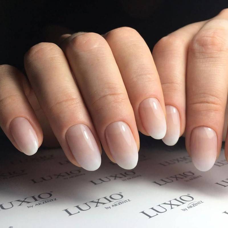Очень красиво и нежно будет смотреться на ногтях нюдовый уход в технике градиент. Растяжка светлыми оттенками прекрасно подходит для длинных и коротких ногтей, причём вне зависимости от формы.