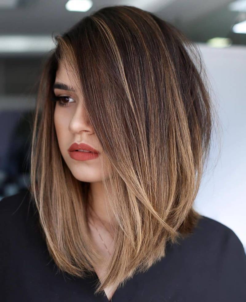 Она слегка обозначена плавным переходом в передние пряди. При этом на затылке волосы намного короче. Такое каре – отличный вариант, чтобы скрыть скулы или визуально сузить овал лица.