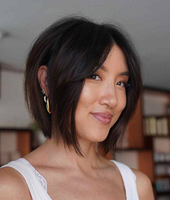 Косая челка хорошо корректирует широкое и круглое лицо. Контур лица становится более мягким