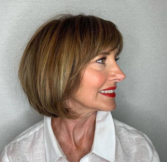Стрижка выполняется слоями, оживляя волосы, поэтому эту модель рекомендуют женщинам в возрасте. Локоны обрамляют лицо мягким силуэтом, освежая его.