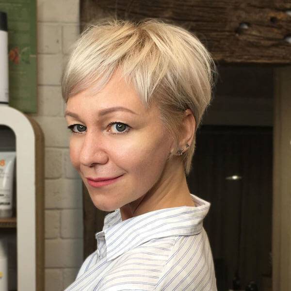 Длина прядей, отсутствие или наличие челки и ее форма, объем в районе макушки — выбирайте вариант на свое усмотрение. Пикси в любом исполнении омолаживает и делает волосы объемнее.