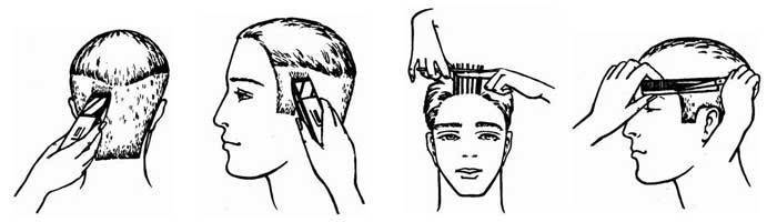 короткие (разделительный край). Все волосы, вплоть до линии края, необходимо подстригать машинкой для стрижки без насадки. При определении разделительной линии следует учитывать следующие нюансы: если у мужчины запавшие виски, краевую линию следует расположить немного ниже, а если у мужчины выпуклые виски, краевую линию следует сделать рельефной. - Затем на пальцах необходимо подстричь волосы на теменной зоне. Это нужно делать поточно за ниткой».