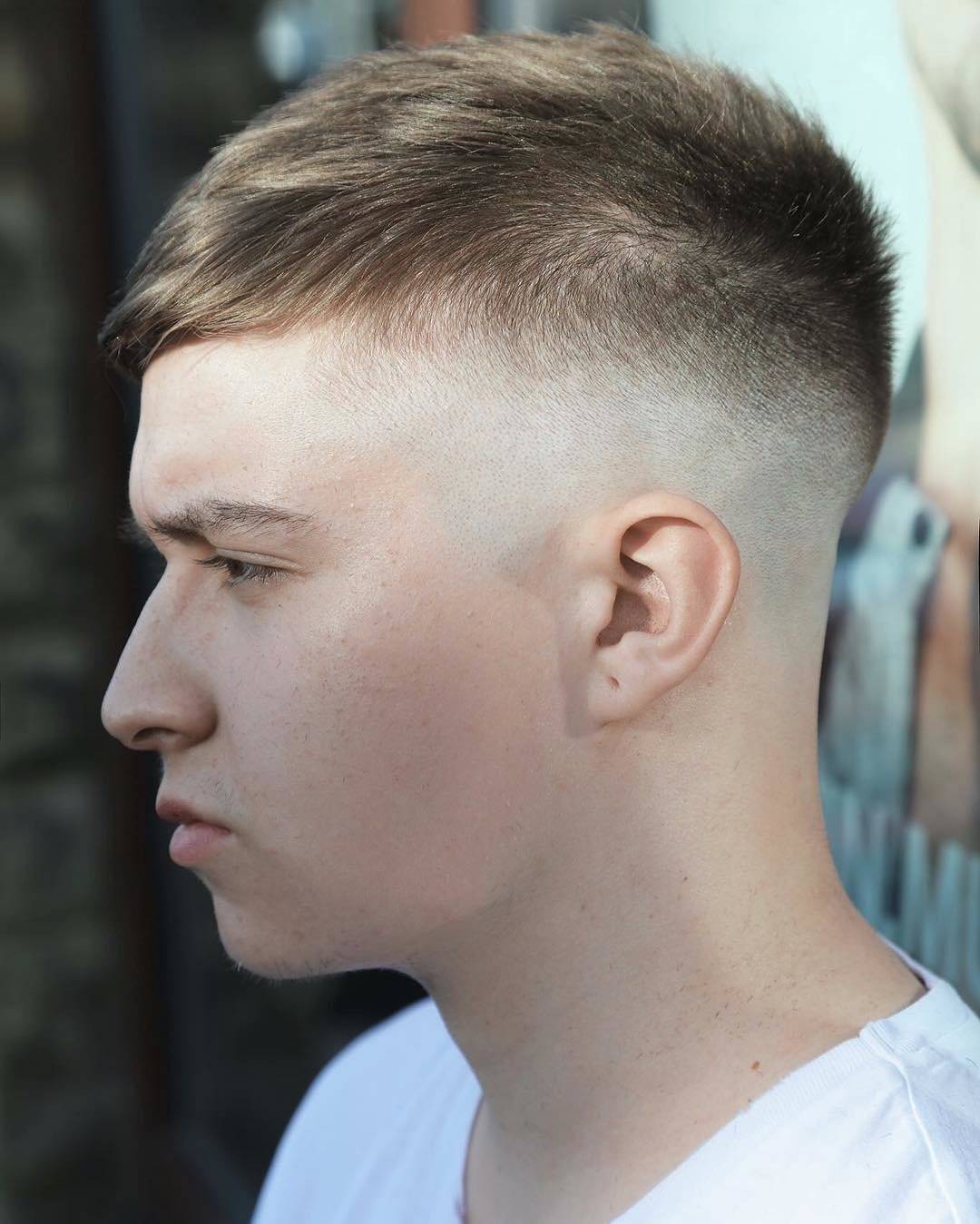 Укороченный вариант прически является классическим. Именно его мы часто можем видеть у спортсменов. Виски и затылки в данном случае стригутся под 1 см или вовсе под ноль. На макушке остается до 2 см.