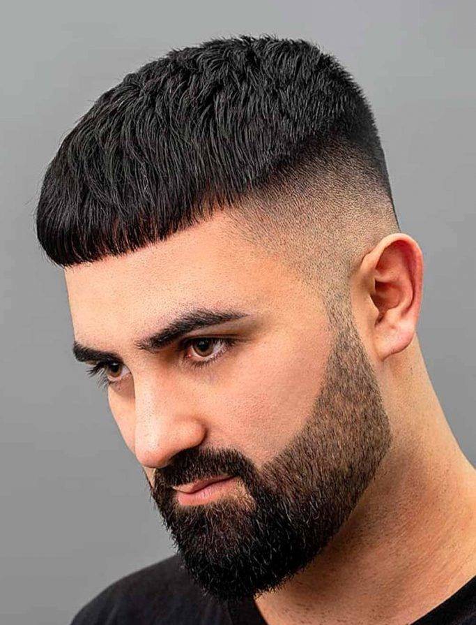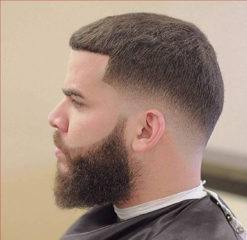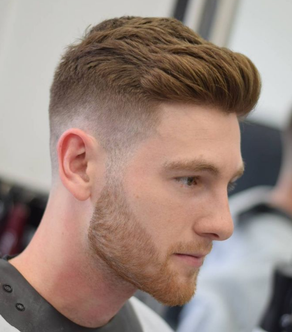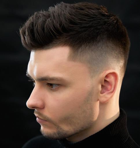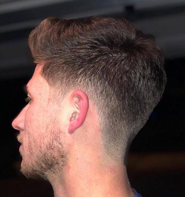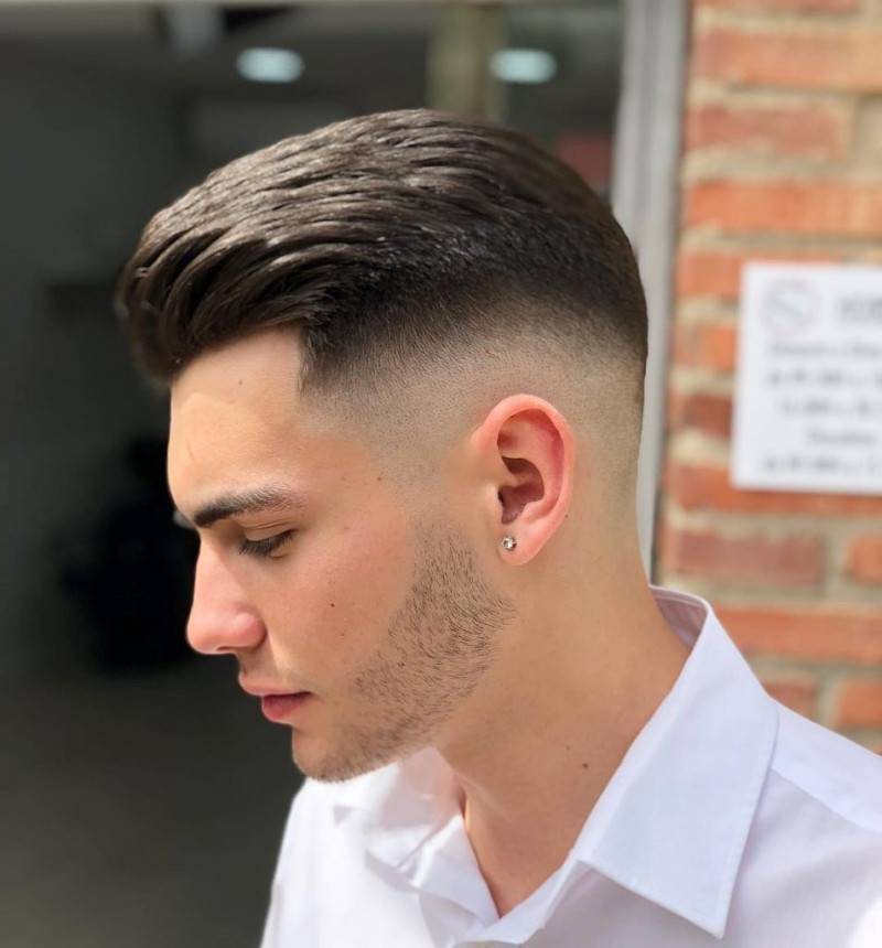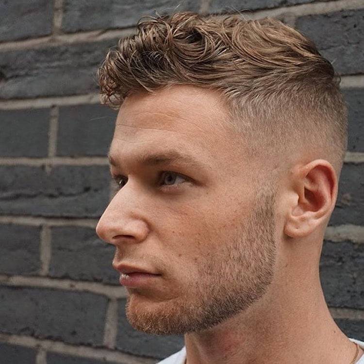 Это компромисс для тех мужчин, которые не хотят слишком короткую стрижку, но и к удлиненному варианту относятся настороженно. Такой вариант не менее мужественный, чем короткая прическа фейд. Волосы короткие сзади и по бокам – длинная часть находится выше ушных раковин. Прическа выглядит линейно, однако, при желании, можно и скреативить. К примеру, уместен выбритый пробор или зачес челки назад. Таким фейдом раньше подстригали военных, однако сегодня стрижка пользуется спросом у лиц любой направленности в работе.