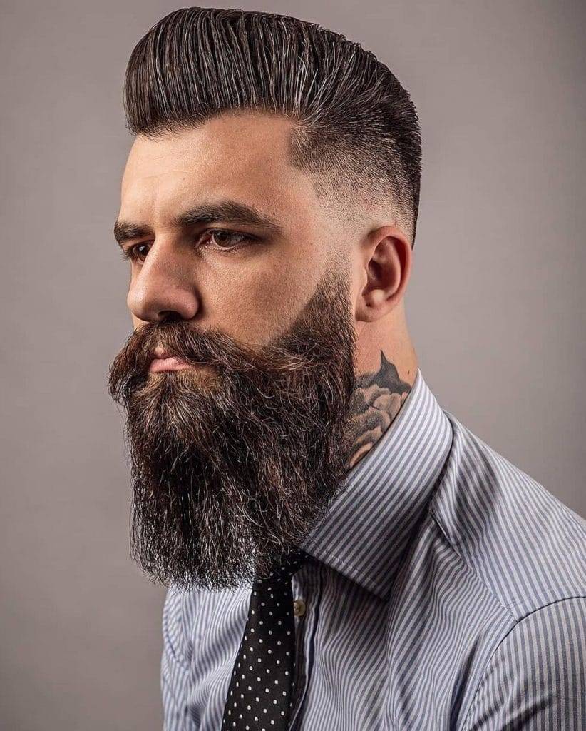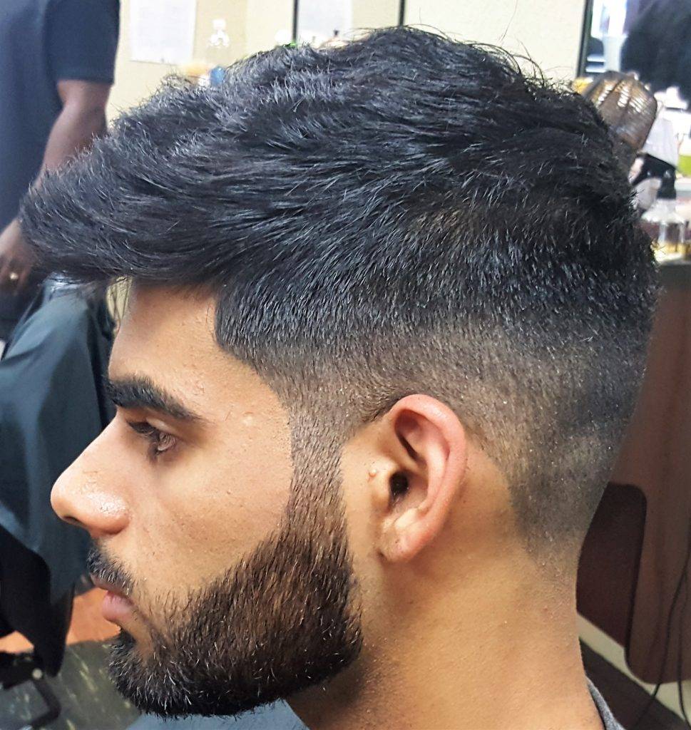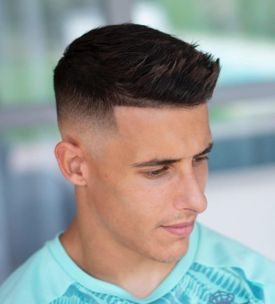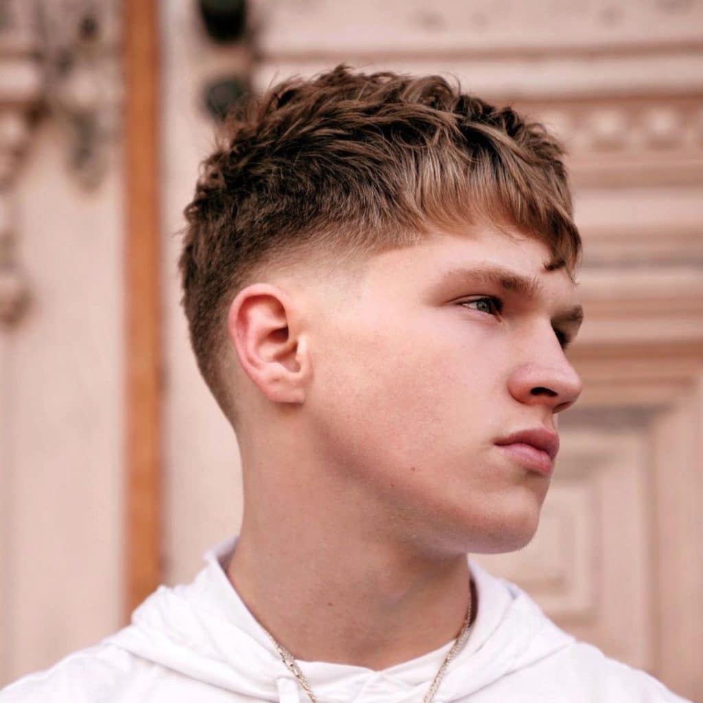 Это компромисс для тех мужчин, которые не хотят слишком короткую стрижку, но и к удлиненному варианту относятся настороженно. Такой вариант не менее мужественный, чем короткая прическа фейд. Волосы короткие сзади и по бокам – длинная часть находится выше ушных раковин. Прическа выглядит линейно, однако, при желании, можно и скреативить. К примеру, уместен выбритый пробор или зачес челки назад. Таким фейдом раньше подстригали военных, однако сегодня стрижка пользуется спросом у лиц любой направленности в работе.