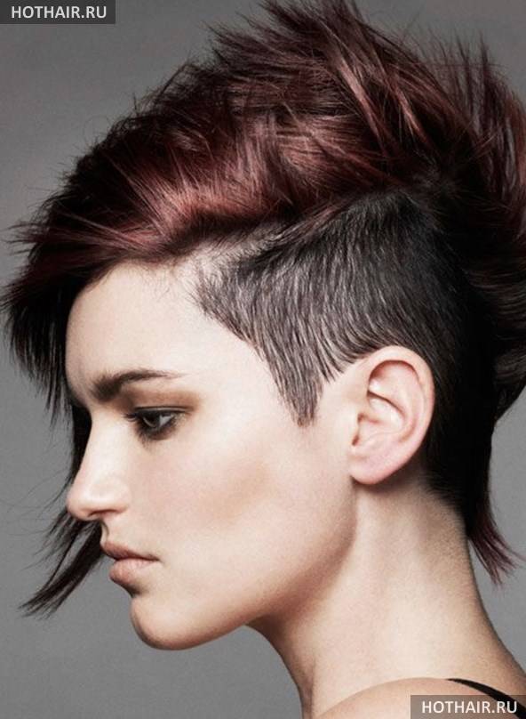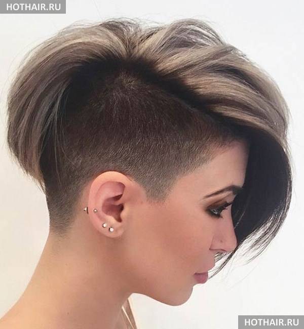 Очень часто молодые и амбициозные девушки выделяют верхние волосы с помощью окрашивания. Либо сама макушка перекрашивается в яркий цвет, например, красный, фиолетовый и даже зеленый, либо наоборот – длинные волосы остаются нетронутыми, а все состриженные пряди на висках и затылке окрашиваются в контрастирующий цвет, чаще всего это блонд при натуральном темном цвете волос и наоборот.