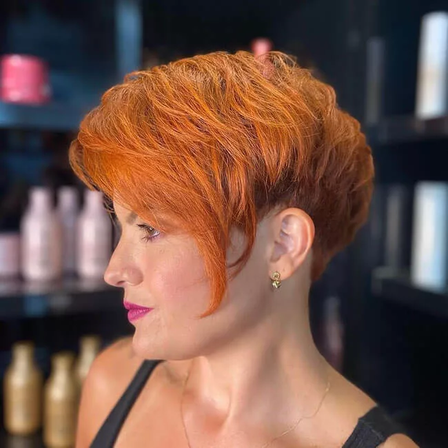 В женственном варианте волосы оставляют максимально длинными, на затылке и висках длина волос может быть до 3-4 см длиной, плавно переходящая в более длинные пряди на самой макушке, а спереди остается длинная градуированная челка, которая может обрамлять лицо, сглаживая любые недостатки. Такой ежик легко превратить в торчащий, путем укладывания челки гелем. Но в большинстве случаев женщины предпочитают создавать элегантные образы с таким видом ежика. Особенно красиво он смотрится на волнистых волосах.