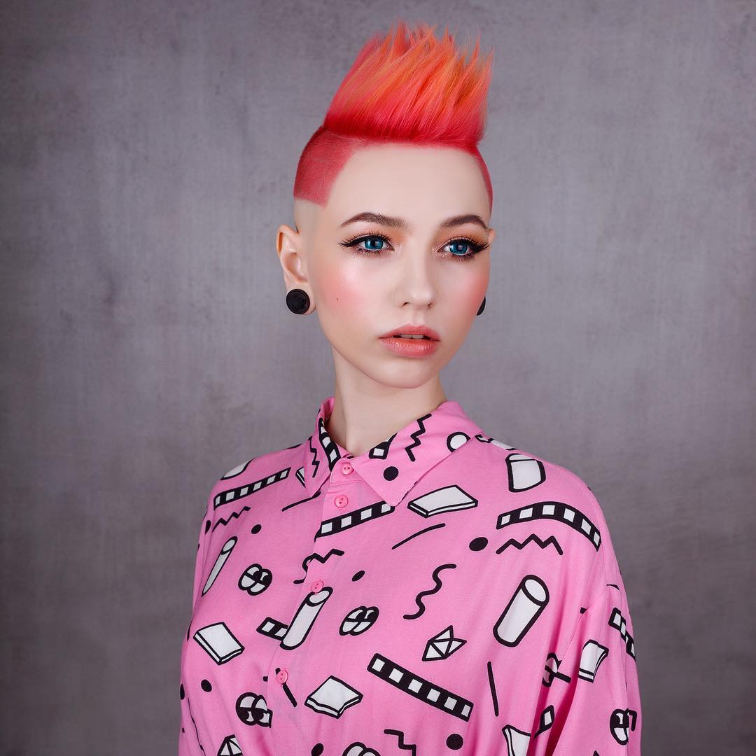 Стрижка ежик может подчеркнуть образ панка, если волосы на макушке поставить ирокезом с помощью геля или лака для волос. Также очень дерзко выглядит эффект хаоса, когда верхние пряди небрежно уложены в разных направлениях. Виски не редко выбриваются.