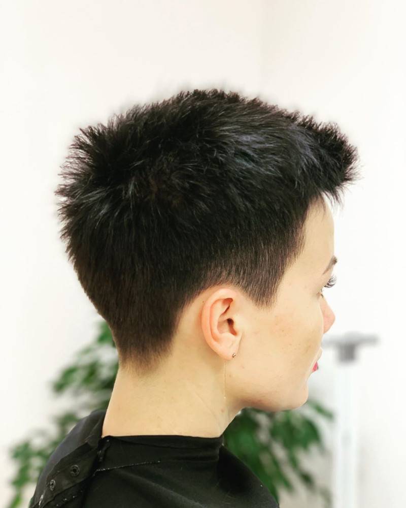 Это дерзкая вариация женской стрижки на короткие волосы ежик, когда пряди выстригаются коротко на затылке и вокруг лица. Если голова у дамы небольшая, красивой формы, всю шевелюру поднимают, направляя перпендикулярно черепу или строго в одном направлении