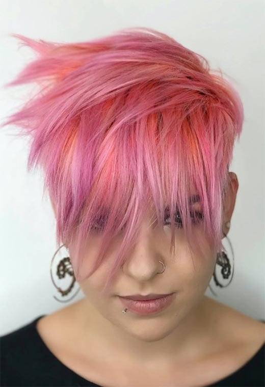 Новым способом выделить свой стиль с косой челкой станет окрашивание прядей в несколько цветов. Неоновая челка в сочетании с пикси – это просто сногсшибательный образ. Если не хочется сильно кричащих оттенков, можно остановится на простом мелировании прядей.