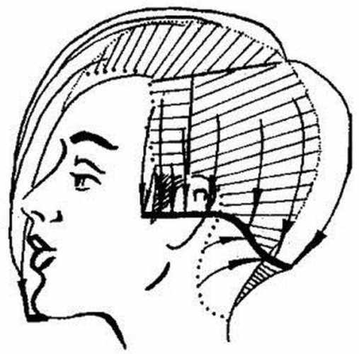- Волосы, расположенные в височно-теменной области, делят на уровни. Их состригают.