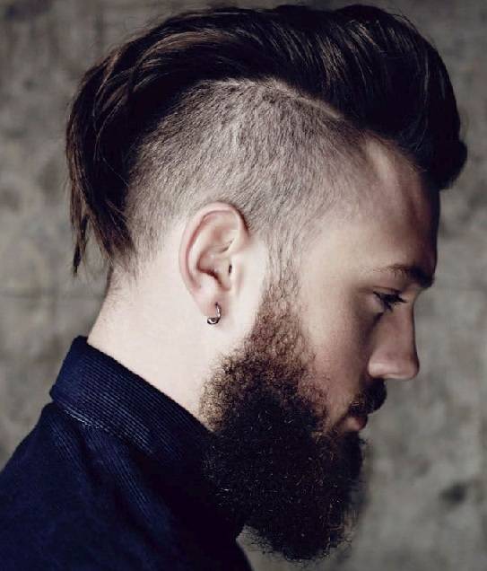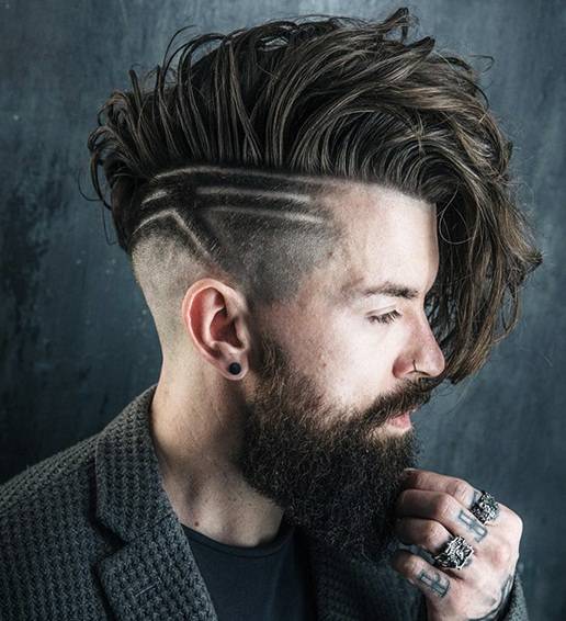 Выбритые виски смотрятся необычно и дерзко. В данном случае предполагаются длинные волосы в верхней зоне головы и выбритые виски. Чтобы сделать прическу более креативной, могут использоваться фигурные выстриги на висках. Подобный вариант часто выбирает молодежь и представители творческой профессии. Также он может сочетаться с бородой.