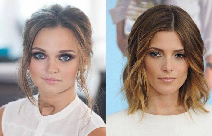 Брови предпочтительнее делать классической формы с закрытым хвостом. Румяна, так же как и при круглом лице, растушевывают диагонально. Неприемлемы геометрические и круглые прически. Хорошо подойдут полуволны, каплевидные формы, рваные, беспорядочные пряди.