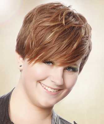 - На коротких волосах и круглом лице отлично выглядит ассиметричные стрижки или укладки с градированием.