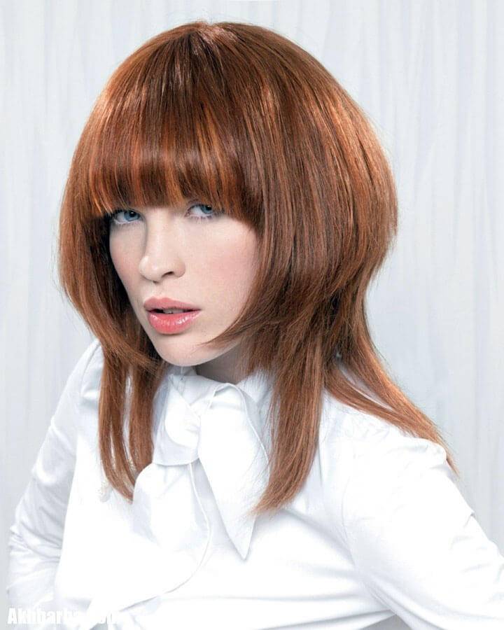 барышням с небольшими глазами и крупным носом лучше выбирать градуированные косые челки, сложная техника позволит скорректировать черты, выделив утонченные линии;